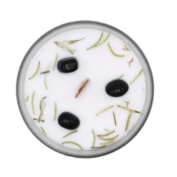 In de kaars liggen edelsteentjes van zwarte toermalijn, de steen van bescherming, aarding en energetische zuivering. Zwarte toermalijn nodigt je uit om negatieve energie los te laten, jezelf te beschermen en in harmonie te blijven.