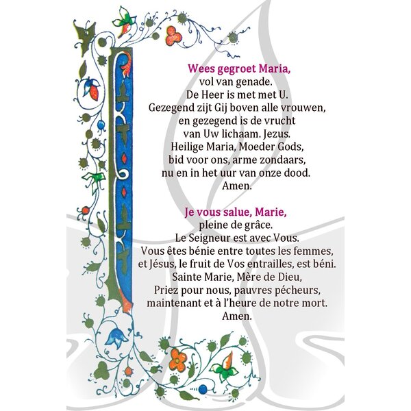 Een noveenkaars begeleidt je tijdens een noveen: een periode van negen dagen waarin je je in stilte, gebed of bezinning richt op een intentie. Dit kan zijn voor genezing, kracht, troost, heling, dankbaarheid of innerlijke rust. Maria nodigt je uit om stil te worden, je hart te openen en te vertrouwen op haar troostende aanwezigheid. In tijden van onzekerheid biedt haar licht zachtheid, kracht en bescherming. Het Wees gegroet Maria - gebed wordt vaak gebruikt om respect, liefde en vertrouwen aan Maria te tonen en haar te vragen om voorspraak en bescherming.